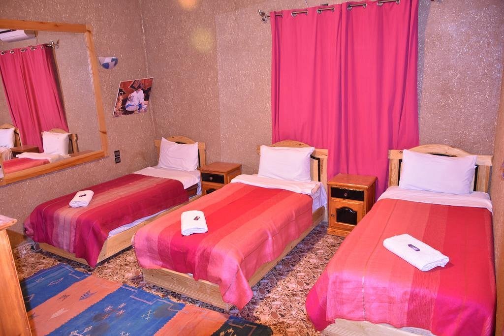 Dotée de trois lits, elle est parfaite pour partager un séjour dans le désert tout en conservant son confort. La décoration saharienne, sobre et authentique, invite à la détente après une journée d’excursion.